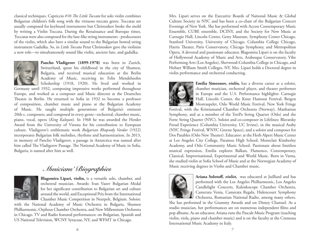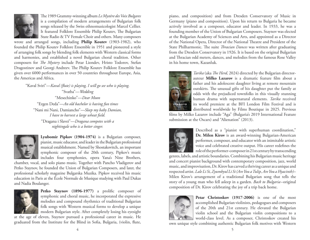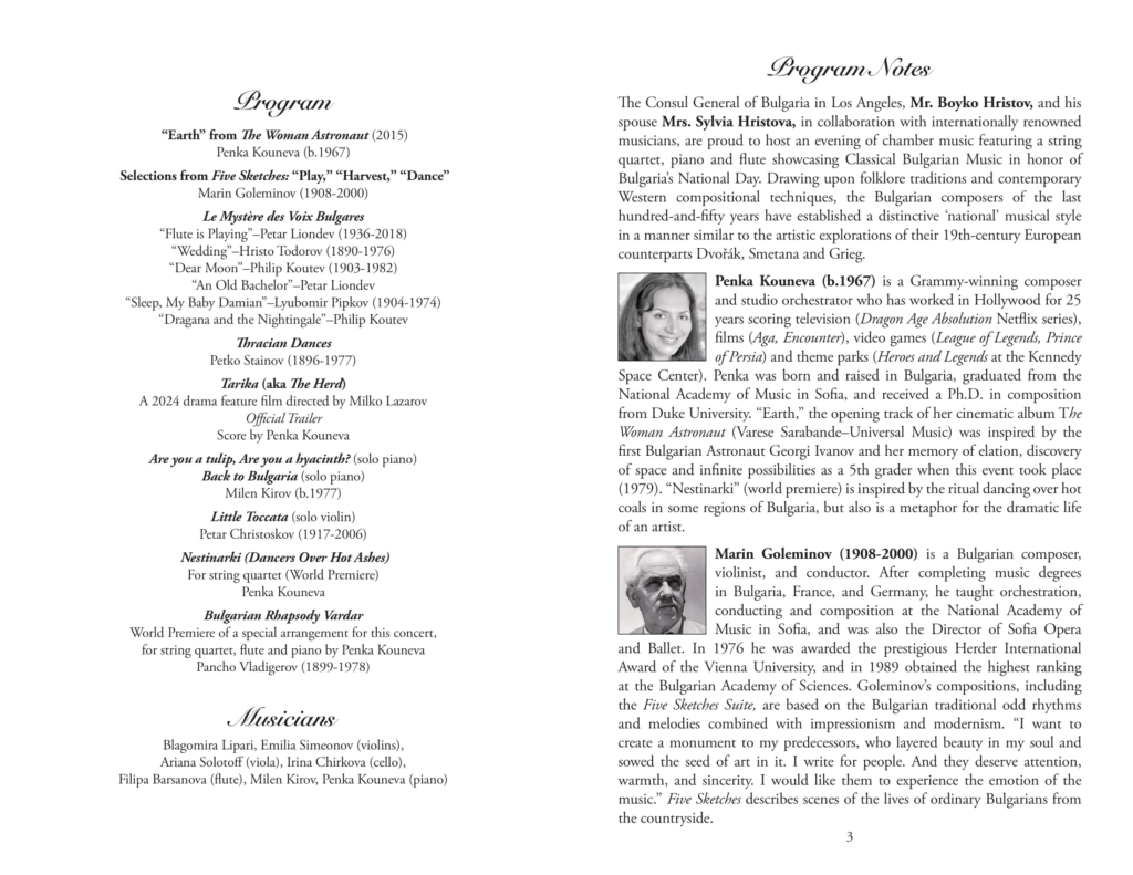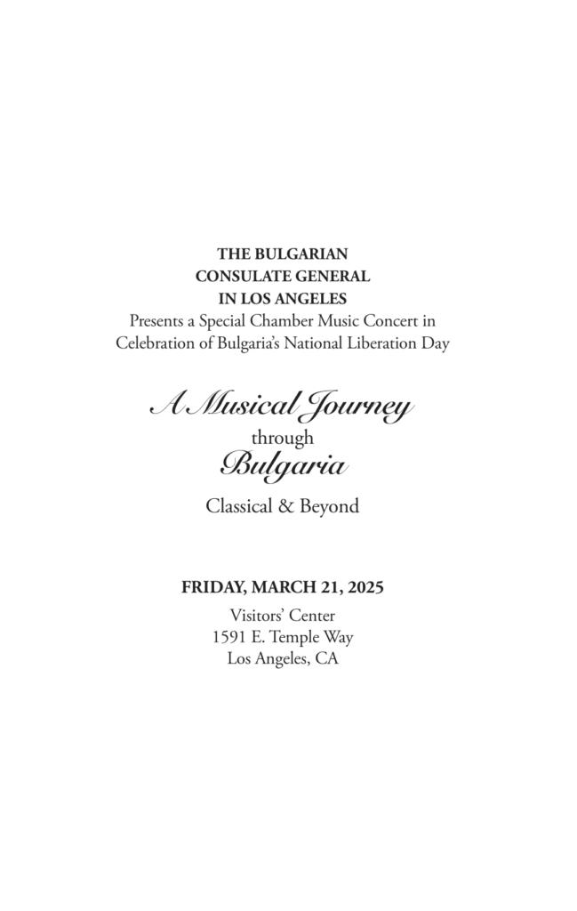 On March 21, 2025, the Consulate General of Bulgaria in Los Angeles produced for the first time a concert featuring classical music by Bulgarian composers, performed by Bulgarian musicians. The concert was co-curated by the Grammy winner composer Penka Kouneva and violinist Blagomira Lipari. This concert inaugurated the Bulgarian Classical Concerts–Los Angeles series.